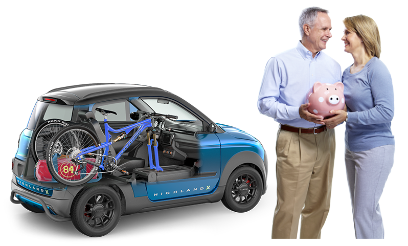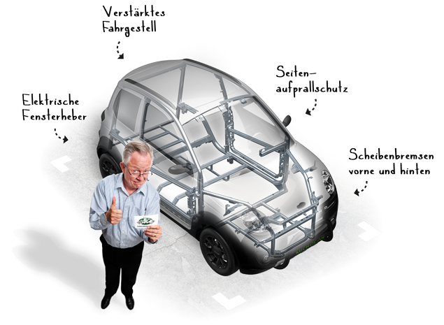 Sicherer als Fahrrad oder Moped dank vier Rädern, geschlossener Fahrerkabine, Seitenaufpallschutz und Stauraum im Kofferraum